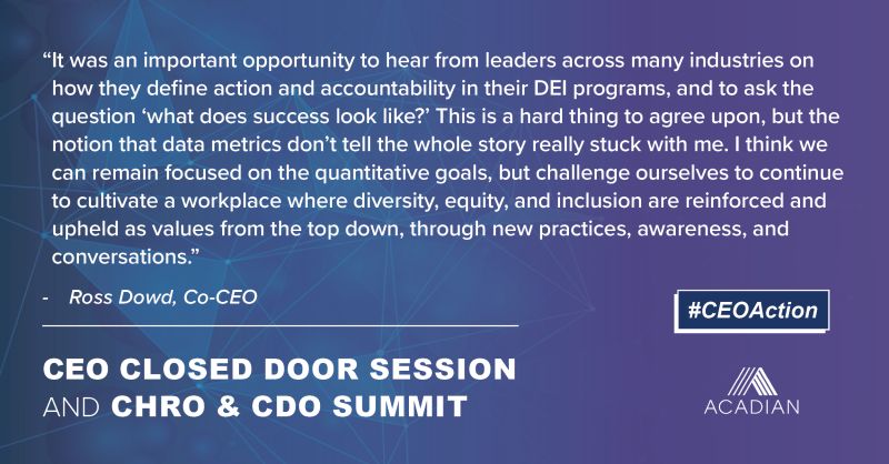 Last week, Acadian co-CEO Ross Dowd attended CEO Action’s 5th annual CEO Closed-Door Session and CHRO & CDO Summit, where he connected with business leaders to build concrete ways to advance diversity and inclusion in the workplace. Link below to learn more about CEO Action.