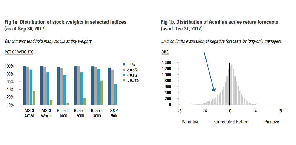 Long-only strategies tied to broad market benchmark indices do not allow the full expression of views on stocks that are likely to underperform. Each stock’s weight reflects the maximum amount that a long-only manager can underweight the security, and weights may be quite small. In the S&P 500, for example, fully 10% of the stocks have a benchmark weight of less than 0.036%, a common occurrence in popular benchmarks (see Figure 1a). The impact of this limit on underweighting will be exacerbated if a manager has particularly strong negative forecasts, a tendency exemplified in the histogram of Acadian alpha forecasts shown in Figure 1b. Long-only portfolios may only capture half of a manager’s alpha forecasts and perhaps omit the highest-conviction signals.